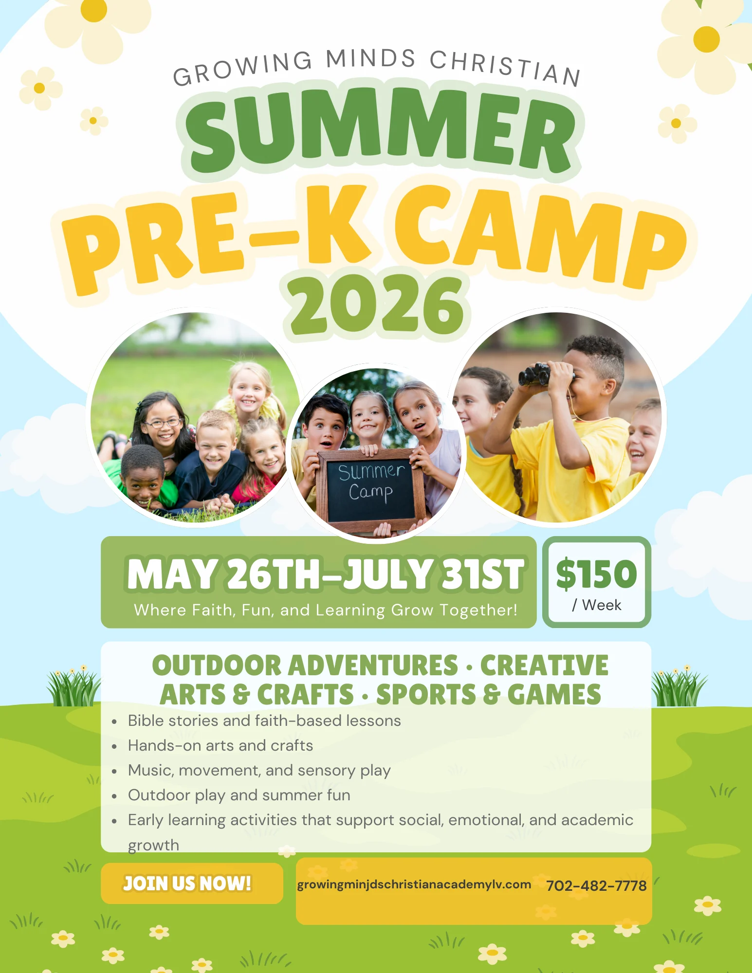 Join us for a joyful summer at Growing Minds Christian Academy, designed especially for young learners ages 3-5!